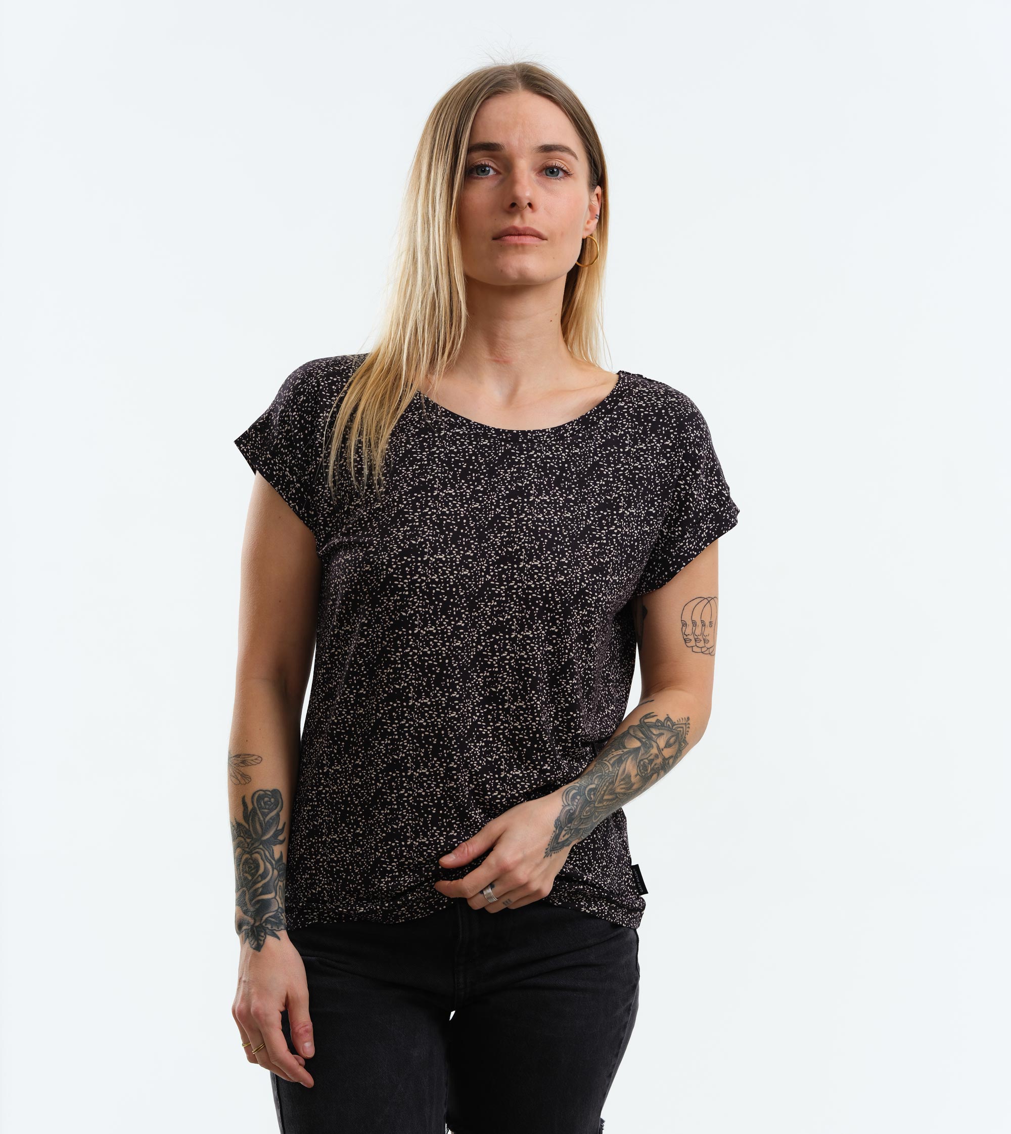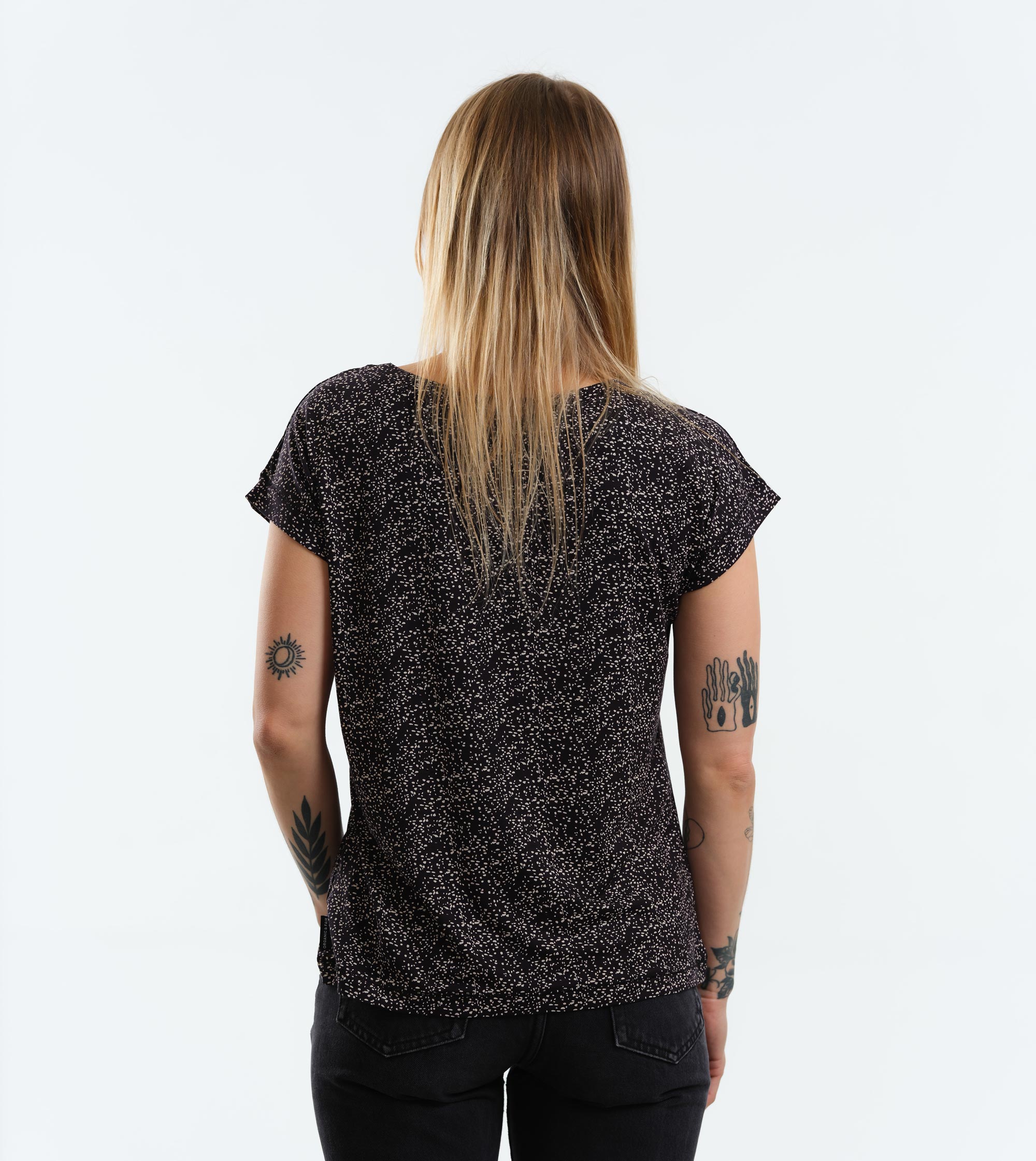 – Color: black with white all-over dot print