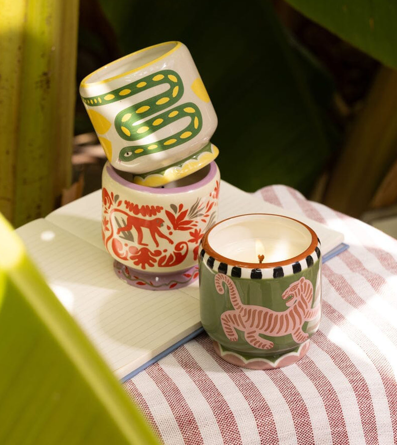 Jedes Keramikgefäß ist in den leuchtenden Farben und einladenden Mustern des Südens gehalten und sorgfältig mit ausdrucksstarken Pinselstrichen handbemalt, was für ein handwerkliches Flair sorgt. Wenn das Wachs aufgebraucht ist, verwandle das Gefäß einfach in einen einzigartigen kleinen Übertopf oder eine Vase und verleihe deiner nächsten Party im Freien Farbe und Verspieltheit!