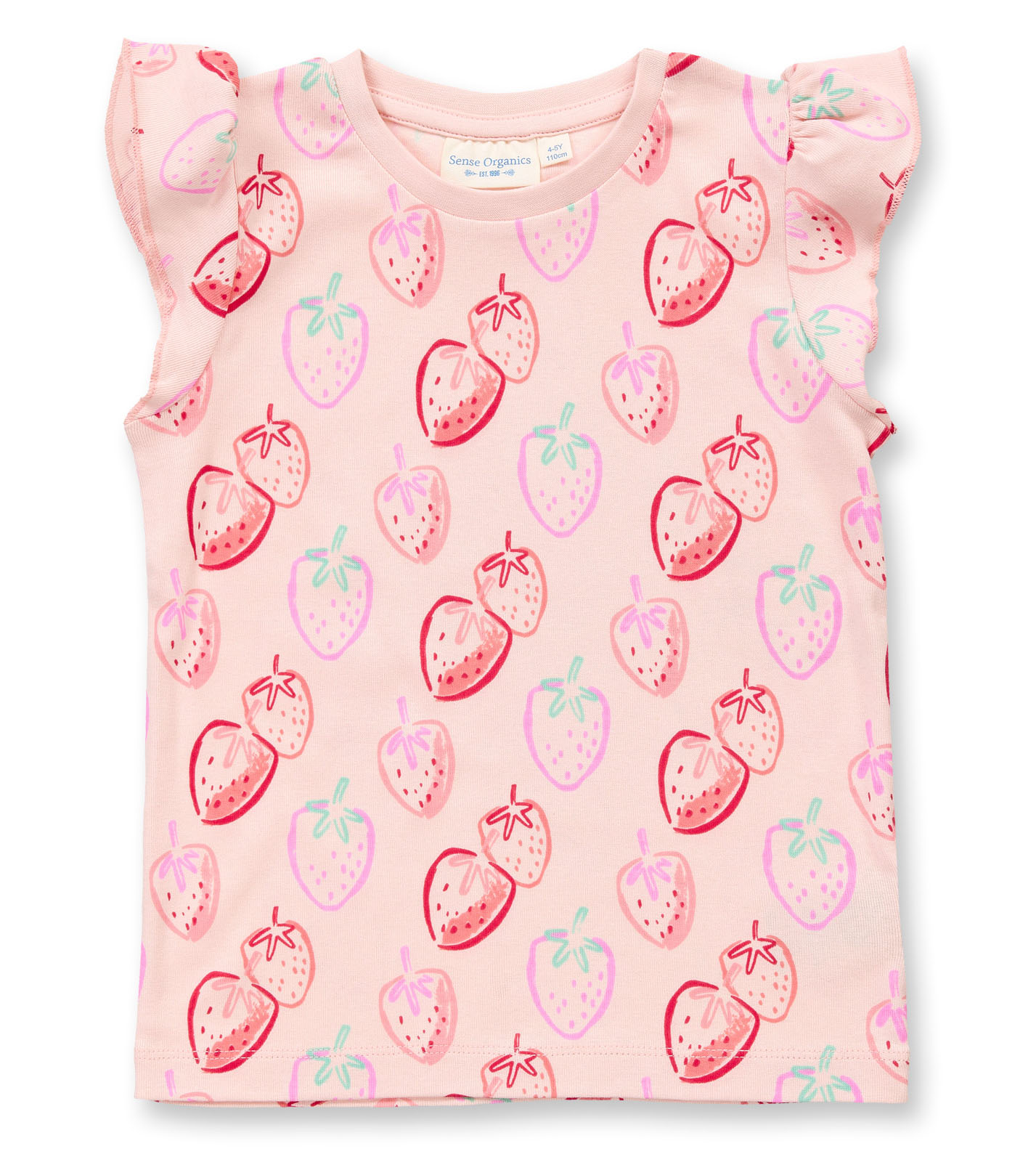 Dank feinem Single Rib Stoff aus 100% Fairtrade zertifizierter Bio-Baumwolle fühlt sich der Pyjama beim Schlafen kuschelig weich an und sieht dabei noch richtig niedlich aus. Viele bunte Erdbeeren auf hellrosafarbenem Hintergrund sorgen für ein fröhliches Design. Die gerafften Flügelärmel am kurzen Arm sind ein schönes Detail.