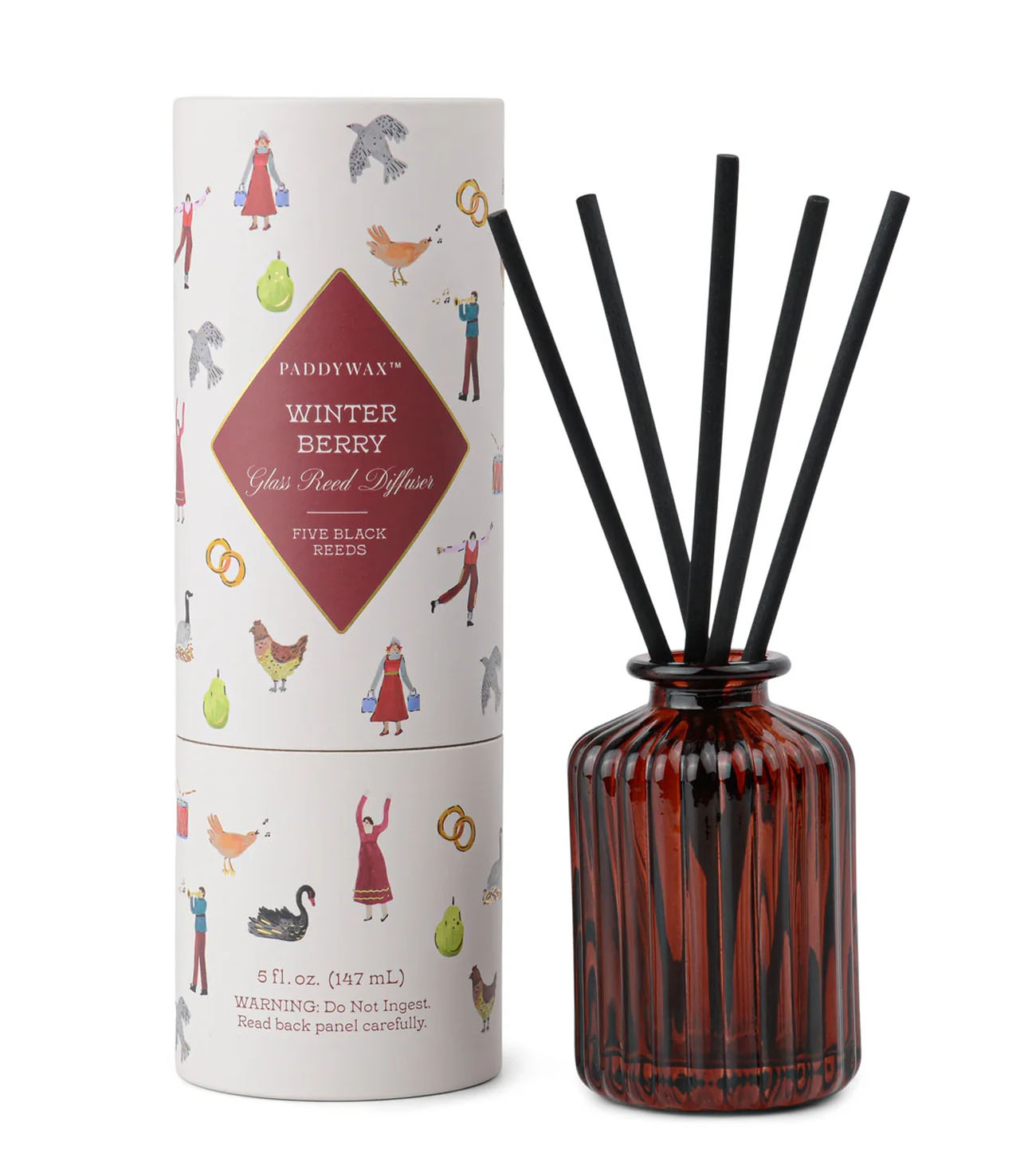 Der wunderschön geriffelte Glasdiffusor in sattem Rot ist gefüllt mit einem festlichen Duft. Jede Verpackung ist mit handgezeichneten Illustrationen verziert, inspiriert von den klassischen „Zwölf Weihnachtstagen“.