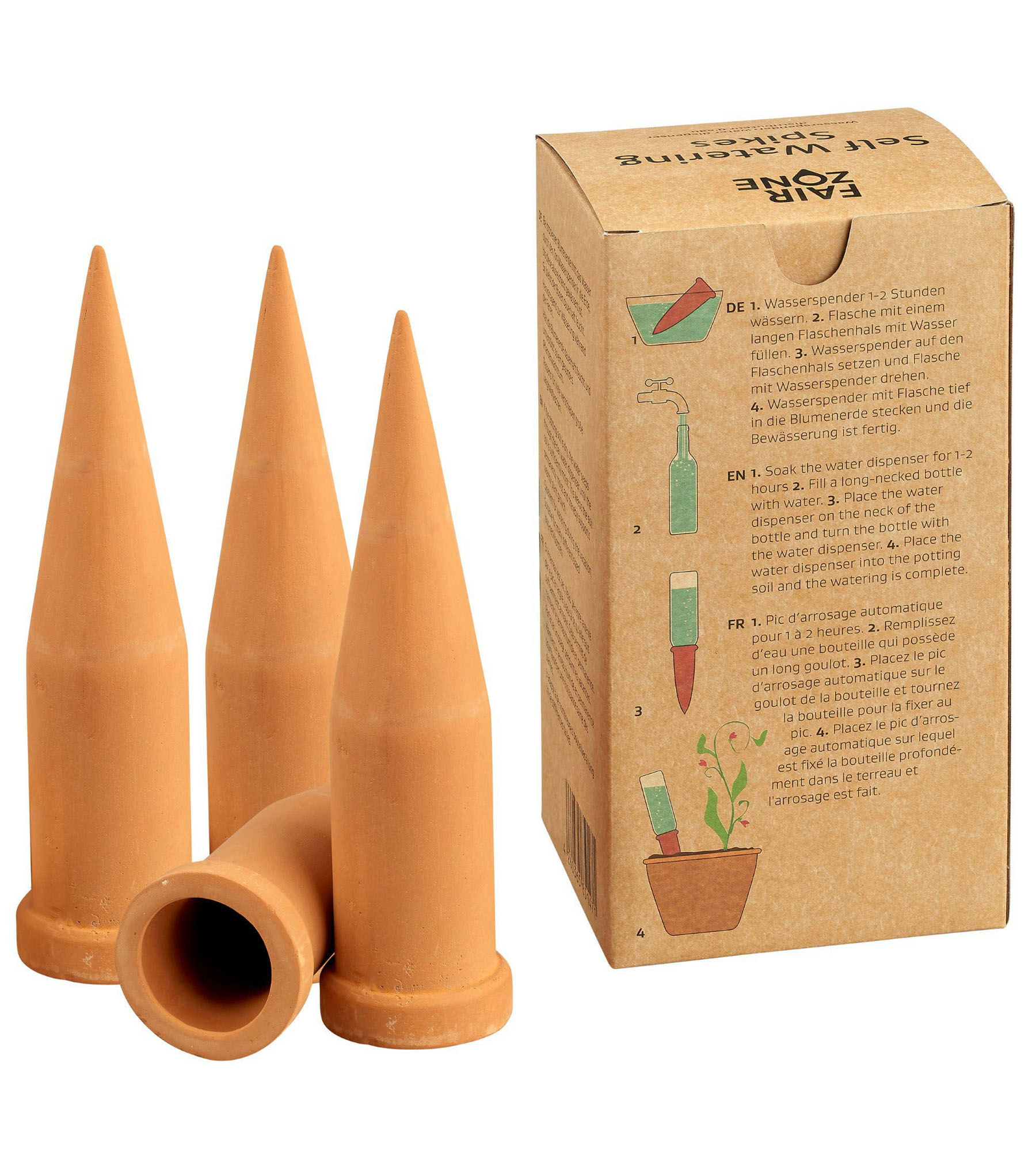 Diese Self Watering Spikes aus Tonerde sind eine absolut natürliche Art der automatischen Pflanzenbewässerung und ebenso simpel wie effektiv. Sie versorgen deine Pflanzen nicht nur während des Urlaubs zuverlässig mit Wasser, sondern nehmen dir auch im Alltag das Gießen ab, indem sie Wasser speichern und nach und nach wieder abgeben.